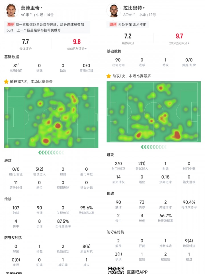本场赛事 米兰中场球员双核拉比奥特和莫德里奇表现出色,拉比奥特全场完成90次触球,73次传送球 并送出1次助功 ,传送球 成功率90.4%;莫德里奇更是完成了全场最高的107次触球,足球直播无插件免费在线观看以高达95.6%的成功率送出了90次传送球 。
