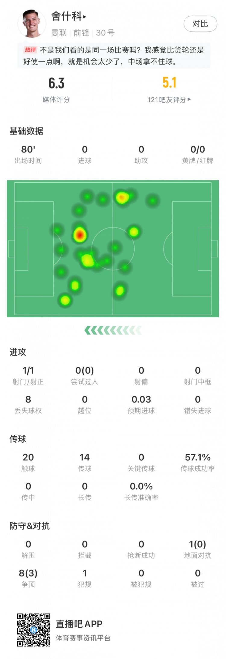9月15日讯 英超曼市德比,曼联前场球员舍什科杆位出战,球员本场数据如下: