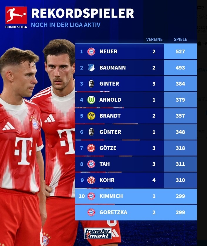 9月26日讯 德国转会市场盘点了德甲现役球员职业联赛 出场数,诺伊尔以527场居首,欧洲杯直播吧基米希、格雷茨卡均299场闯进前10,即将迎来300场里程碑。