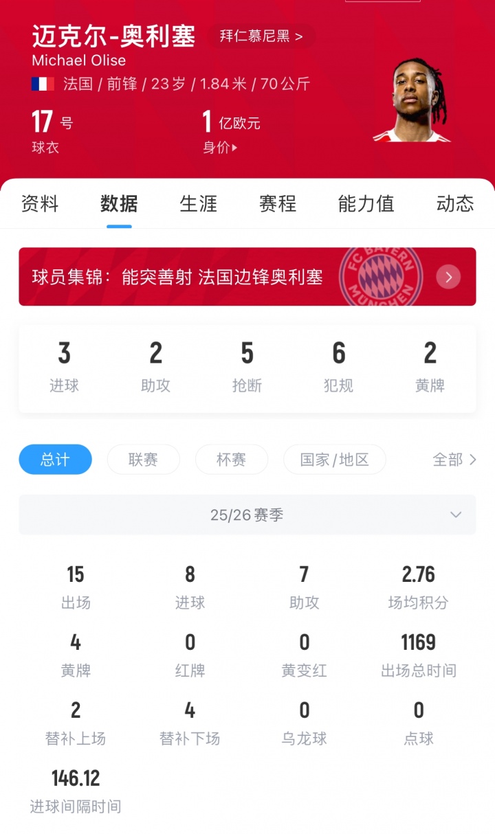 奥利塞现年23岁,司职右翼锋,他本赛季为拜仁出战15次,贡献8球7助,他与拜仁的合同在2029年到期,现身价1亿欧。