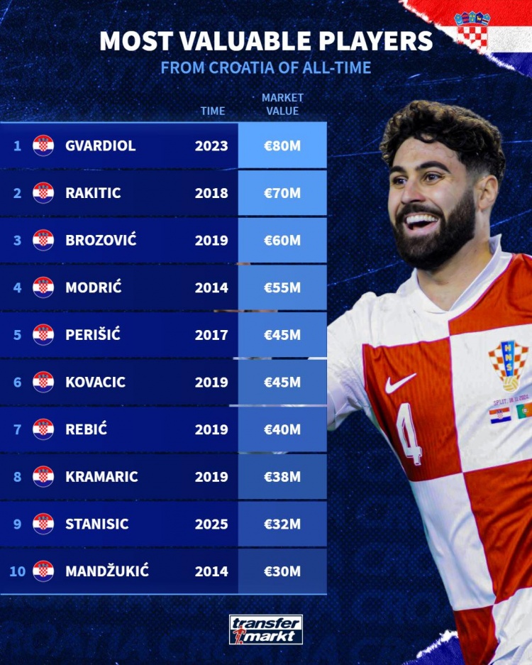 10月13日讯 德国转会市场统计了克罗地亚球员的历史最高身价,并列出克罗地亚球员历史身价排名,欧洲杯直播吧格瓦迪奥尔8000万欧居首。